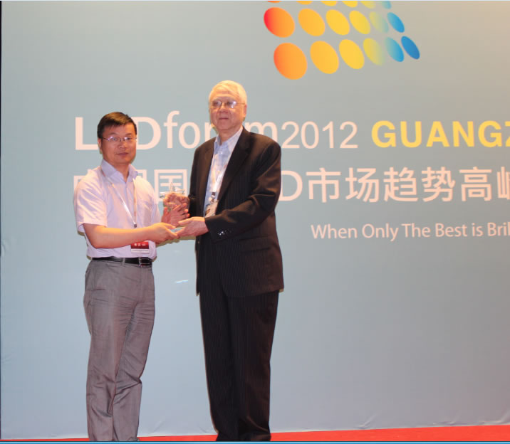 图为LED-Inside董事长刘炯朗博士替昀丰董事总经理徐永亮先生颁奖